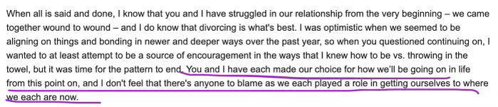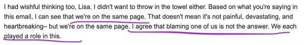 Therefore, I kept holding out hope that all I was facing was a deeply wounded man who’d run scared back to his old life. After all, if he truly thought we were divorcing because he left a cult while I’d stayed, why agree that we’re on the same page? And why ask for continued access to a supposed cult leader and her teachings followed by THANKING HER for their wisdom?